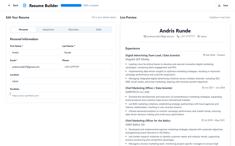 Our AI doesn’t just create a generic CV — it adapts your CV to each job description, ensuring a 1:1 match with the specific position you’re applying for. 89% of users land a job significantly faster with our CV maker.